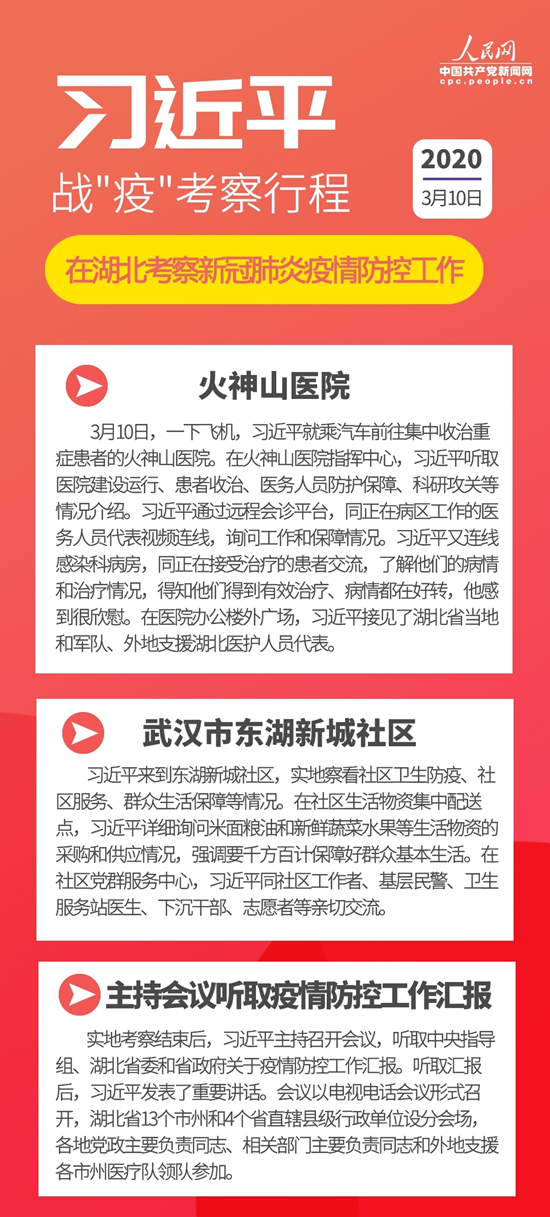 【编者按】“关键时刻,决胜之地,领袖和人民在一起。”3月10日,中共中央总书记、国家主席、中央军委主席习近平专门赴湖北省武汉市考察新冠肺炎疫情防控工作,看望慰问奋战在一线的广大医务工作者、解放军指战员、社区工作者、公安干警、基层干部、下沉干部、志愿者和患者群众、社区居民。据了解,这是自疫情发生以来习近平总书记第三次亲临战“疫”一线考察调研。2月10日,习近平深入北京市社区、医院、疾控中心,了解基层疫情防控工作情况;3月2日,习近平在北京考察新冠肺炎防控科研攻关工作。