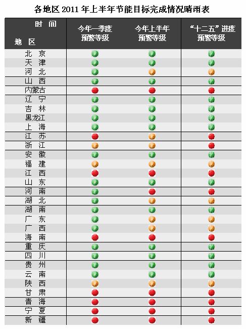 为督促各地做好各项节能工作,我们建立模型对各地区上半年单位GDP能耗变化情况进行了预测,并与各地区年度及“十二五”节能目标任务进行了比较分析,确定了各地预警等级,制作了各地区节能目标完成情况晴雨表。