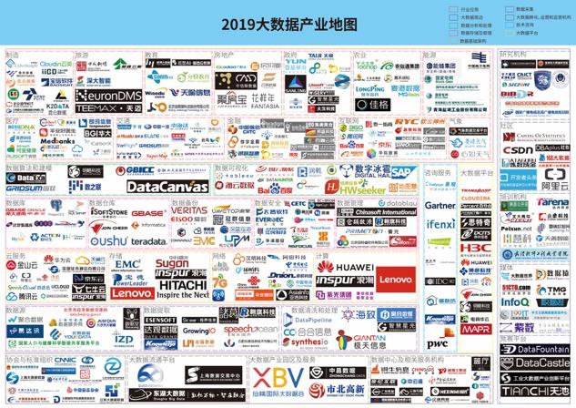 2019年大数据产业地图,其实可以明显的看出来针对刚刚三个层次有很多的针对性企业在做相关的事情,比如我们总结上游数据、中游产品、下游服务。上游数据是做数据的收集、流通,比如帮助你采集数据,帮助你把数据从一个单位流转到另外一个单位,这是上游数据干的事情。