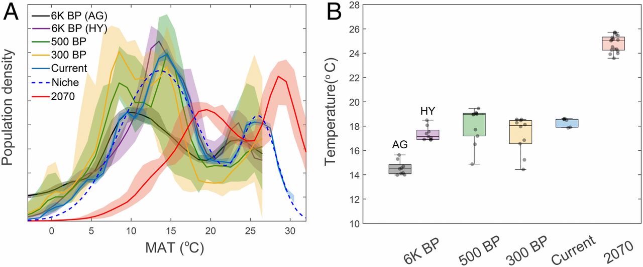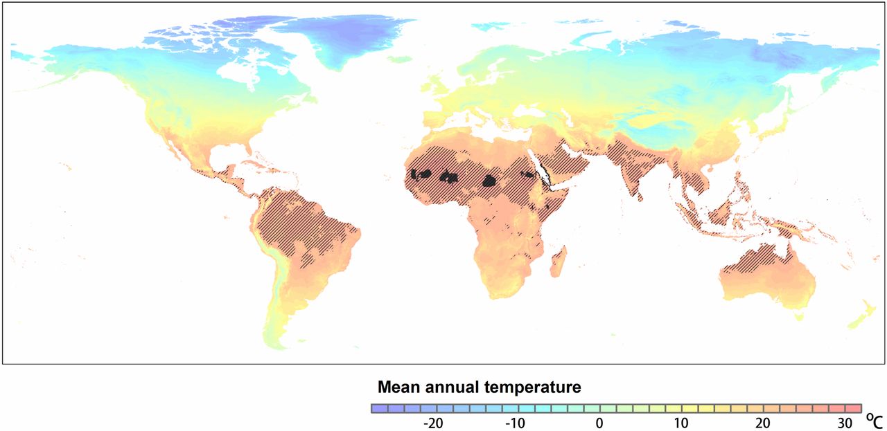 “研究结果还是挺出乎意料的。”该论文第一作者、同时也是两位通讯作者之一的南京大学生命科学学院教授徐驰对澎湃新闻表示,气候变化会对人类社会和许多物种产生影响已是共识,但该研究进一步发现,全球大多数人口一直集中生活在相对狭窄的气候带内,这些区域的年平均气温为11-15摄氏度,少数人口生活的地区年平均气温为20-25摄氏度。数千年来,尽管人类不断迁徙,技术不断进步,但人类整体的分布格局与气候条件的这种对应关系保持了相对稳定。
