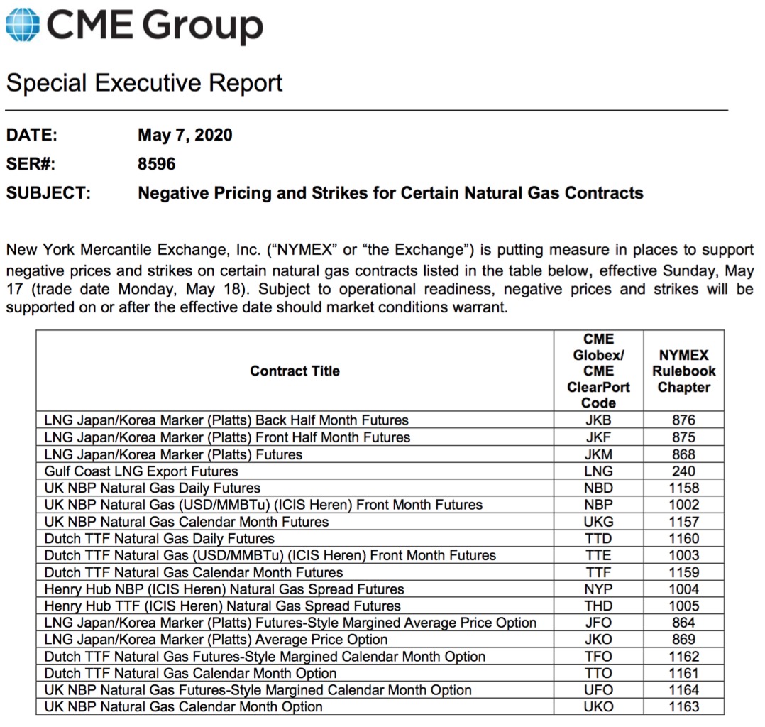 全球最大衍生品交易所芝加哥商品交易所(CME Group)当地时间5月7日发布公告,旗下纽约商品交易所有限公司(NYMEX)正在采取措施,允许部分天然气期货合约价格和期权合约行权价格为负值,自5月17日开始生效(5月18日周一为交易日)。在准备就绪的前提下,如果市场条件允许,交易所将在生效日或之后为这部分天然气合约的负价提供支持。这些引入负价格机制的合约将在5月11日的新版本中供客户测试。