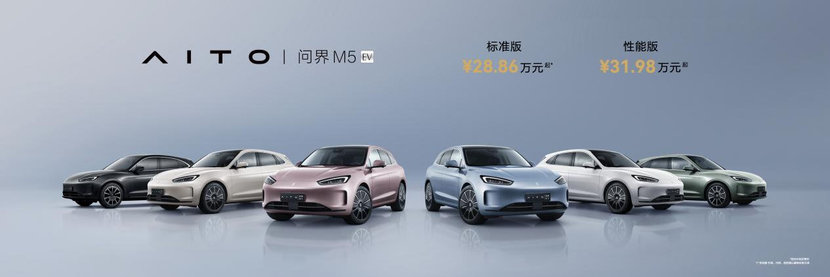 作为AITO品牌推出的首款纯电车型,问界M5 EV问界M5 EV全系共提供六款车身颜色、四款内饰颜色,全国建议零售价为标准版 28.86万元,性能版 31.98万元。9月6日起,问界M5 EV将陆续在各华为门店及赛力斯用户中心进行真车展示,9月24日起正式开启试驾。