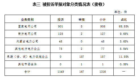 供电企业1158件、占投诉举报总数的87.99%,其中国家电网公司906件、占投诉举报总数的68.85%,南方电网公司127件、占投诉举报总数的9.65%,内蒙古电力公司48件、占投诉举报总数的3.65%,其他地方电力企业77件、占投诉举报总数的5.84%;承装(修、试)电力设施企业157件、占投诉举报总数的11.93%;其他市场主体1件、占投诉举报总数的0.08%。