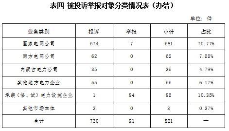 从被投诉举报对象看,供电企业733件、占投诉举报总数的89.28%,其中国家电网公司581件、占比70.77%,南方电网公司62件、占比7.55%,内蒙古电力公司35件、占比3.65%,其他地方电力企业55件、占比6.17%;承装(修、试)电力设施企业85件、占比10.35%;其他市场主体3件、占比0.37%。