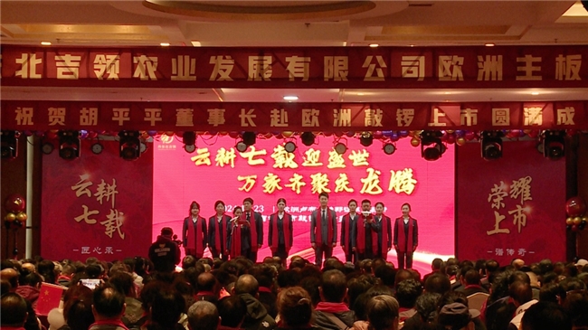 北京时间10月23日下午3点58分,当地时间10月23日上午9点58分,中国辽宁丹东北吉领农业发展有限公司董事长胡平在欧洲卢布尔雅那证券交易所上市敲锣盛典直播在辽阳举行。