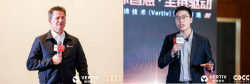 世纪互联研发总监杜华锐与维谛技术中国区研发部总监张迪,展示了双方联合研发的最新成果,包括全国最大规模分体式氟泵无水制冷技术应用,以及行业首台交直流一体驱动风墙空调。