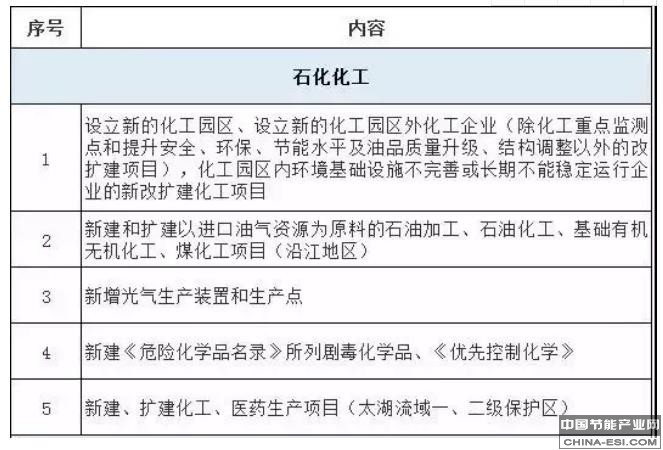 同时,江苏省配套出台了《江苏省产业结构调整限制、淘汰和禁止目录》,其中,禁止类项目为:设立新的化工园区、设立新的化工园区外化工企业(除化工重点监测点和提升安全、环保、节能水平及油品质量升级、结构调整以外的改扩建项目),化工园区内环境基础设施不完善或长期不能稳定运行企业的新改扩建化工项目;新建和扩建以进口油气资源为原料的石油加工、石油化工、基础有机无机化工、煤化工项目(沿江地区);新建《危险化学品名录》所列剧毒化学品、《优先控制化学》;新建、扩建化工、医药生产项目(太湖流域一、二级保护区)。