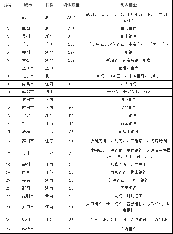 各大钢企所在地疫情统计表(附部分代表钢企)