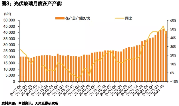 根据卓创华体会(中国)的统计,2021年初超白压延在产产能29540t/d,至今达到41260t/d,净增量达 11720t/d,Q4产能或持续增加。3月后光伏玻璃价格出现大幅下行,叠加“双碳”背景下地方政 府能耗指标或有收紧趋向,当前不能排除后续产线延期投产可能,据卓创华体会(中国),目前行业内少数 产线的点火计划延期。