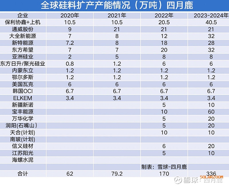 目前协鑫扩20-30万吨,通威扩20万吨,东方希望扩20-25万吨。目前全球硅料57万吨,仅仅这3家扩产就让行业翻倍。还不算大全、新特的扩产,还有海螺水泥、信义硅材、润阳新能等等,大约70-100万吨。
