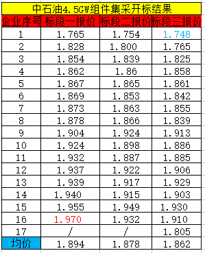 12月27日,中国石油工程建设有限公司4.5GW光伏组件框架集采开标。此次招标按照区域分为三个标段,各标段以445-455Wp与540Wp以上进行综合报价,共17家组件参与了此次投标,从各企业投标价格可以看到,大部分报价仍然维持在1.8-1.9元/瓦上下,其中TOP 6组件企业的报价也基本按照出货量排名从高到低依次递减,各标段的最高价也均出自于TOP 6组件企业,平均报价仍在1.91元/瓦左右。但是据了解,此次调价机制将根据合同签订前的组件进行,而此也就意味着最终的成交价格将低于开标价格。此次投标最低价格为1.748元,如果中标,或创下近期新低。