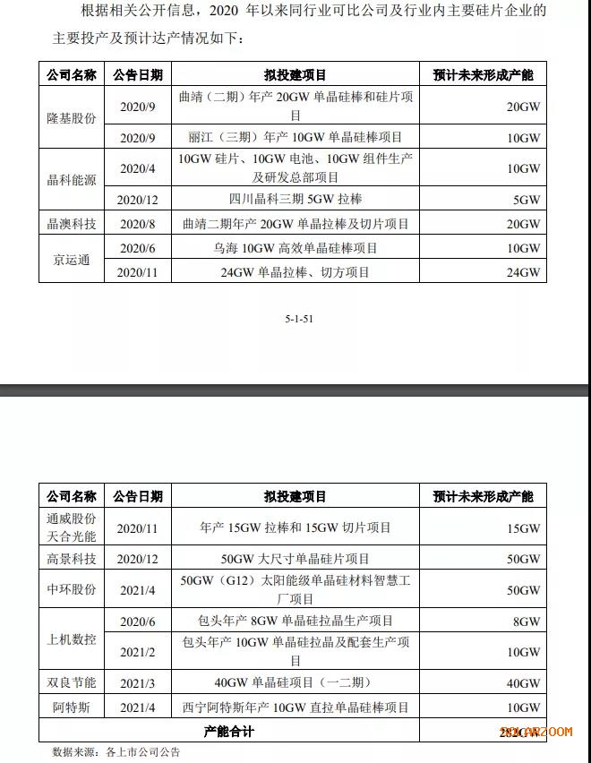 当然,隆基股份的整体扩产速度也很快,明年会达到120GW。两家上市公司的硅片产能将超越250GW。