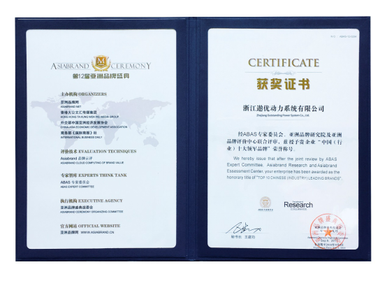 2017年9月9日,“第12届亚洲品牌盛典”在香港嘉里酒店隆重举行。浙江遨优动力系统有限公司被评为中国高能锂电十大领军品牌。