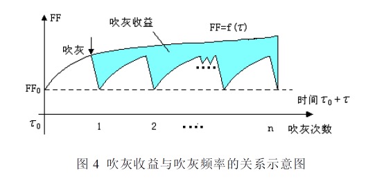 单位时间段内,吹灰次数越多,总的吹灰收益越大,显示了吹灰收益与吹灰频率的关系,如图4所示。
