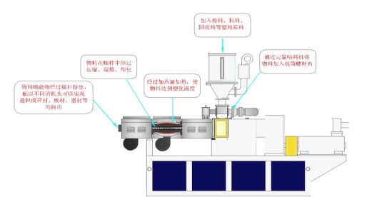 塑料物料(包括各种粉粒、粒料、回收料等)经过定量喂料机加入机筒螺杆,再经过加热圈加热以及螺杆对物料的压缩、混炼,达到熔融状态,将物料挤出,根据加工需要配以不同的模具。节能型锥形同向双螺杆挤出机主要应用于物料挤出造形。该技术的工作原理和工艺流程见图1、图2、图3。