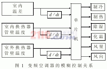 变频空调器采用模糊控制技术输入作模糊技术处理后,可实现对多变量的华体会(中国)控制,其控制关系如图1所示。它包括三个输入量:室内温差及其随时间的变化率,室内热换器管壁的温度及其时间的变化率,室外热换器管壁的温度及其随时间的变化率。输出量包括对空调器和制冷、制热、除湿、化霜、风向、风量等功能实行智能化控制.