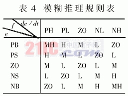 其中Ai:温差e的模糊子集,Bj:温差变化率de/dt模糊子集,Cij:输出量?模糊子集。根据实际运行经验进行分析、归纳,可确定模糊控制规则如表4所示。