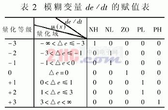设温差变化论域划分为7档{-3,-2,-1,0,1,2,3},通过统计可得模糊量de/dt的赋值表,如表2所示。