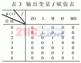 设输出量量论域为7档{0,1,2,3,4,5,6}。通过统计可得输出变量?的赋值表如表3所示。