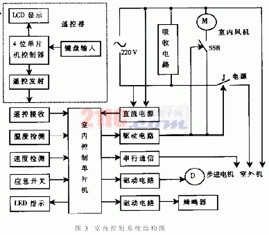 新型的变频式模糊控制空调器实际上是一个多CPU控制系统,如图3和图4所示。它主要包括三个部分:红外遥控发射系统、室内机组控制系统、室外机组控制系统。其中红外遥控发射系统是一个良好的人机交互系统,便用用户选择相应的空调器工作方式和式作参数,控制空调器的开停;室内机组控制系统接收徕自于发射系统的遥控指令,借助于传感技术,采用模糊逻辑推理自动设定风机的转速和压缩机工作频率,控制室愉风机的无级调速以及风门的摇摆动作,并且将有关的决策信息通过串行通信方式传关到室外机助; 室外机助控制系统接收室内机助的串行指令,利用PWM脉宽调制技术实现压缩机的制冷量连续调节。三者既相互独立,又能有效地传递、交换信息,最终成为一个有机的整体,使之达到操作方便、工作可靠、技术性能稳定、性价比高等期望结果。