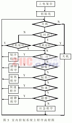 室内机是控制系统的核心。其软件控制系统由主程序和若干子程序组成。子程序包括三个层次,最高层次有制冷子程序、除湿子程序、快速/超静子程序、应急控制子程序;中间层次有风机速度控制子程序、风门步进电机控制子程序、红外遥控指令输入捕捉中断子程序、实时时钟中断服务子程序、IRQ外部中断报务子程序;最低层次不串行通信子程序、数据采集及滤波子程序、延时子程序、报警提示子程序、模糊推理机等。其主要程序流程图如图5所示。