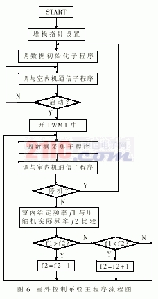 室外机控制系统软件可分为压缩机变频控制模块,与室内机的通信模块和信号采集、控制输出三大模块。其中变频控制软件是室外机控制系统的核心。其主程序流程图如图6所示。
