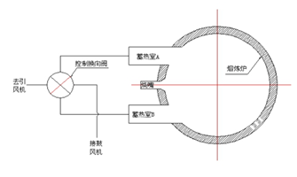 如图 2 所示,当常温空气经过蓄热室(蓄热室 A、B 内装高铝耐火球)A 时,蓄热室 A 内的耐火球的热量传给了空气,使空气达到 1100℃以上的高温,经过风口 A 返回给炉膛助燃;燃烧产物(烟气)经过风口 B 进入蓄热室 B 将热量传给蓄热室 B 内的耐火球。换向后风口 B 返回热空气给炉膛助燃,风口 A 排烟气给蓄热室 A 的耐火球蓄热。A、B 风口进入热空气、排出热烟气反复更换,耐火球放热、蓄热也伴随变化,助燃风进入炉膛温度始终保持在 1000-1100℃(比炉温低 80~150℃)以上。按国内公认的加热炉节能理论,助燃风每提高 100℃节能约 5%。在蓄热系统按上述交替方法工作的同时,燃料燃烧系统按照未进行蓄热式改造前的原有方式正常工作,向大气的排烟温度低于 150℃。