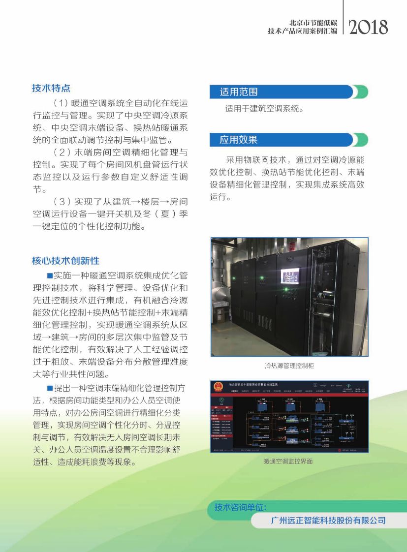 该技术采用物联网技术,根据室外气象情况及空调冷负荷变化,对制冷主机、冷冻水泵、冷却水泵、冷却塔、各类阀门进行优化控制与调节,保障冷量按需供应;对空调机、风机盘管和新风机等位置分散的空调设备进行管理控制满足末端舒适性,通过对空调冷源优化控制、末端集中监控与管理,实现系统高效运行,空调节能率达15%-30%。