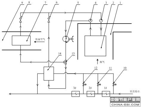 1为尾部烟道,2为烟气冷却器,3为进口集箱,4为出口集箱,5为循环水泵,6为给水加热器闸阀,7为空气加热器,8为空气加热器闸阀,9为风道,10~12为低压加热器分水调节阀,13为余热利用导向阀,14为给水加热器。