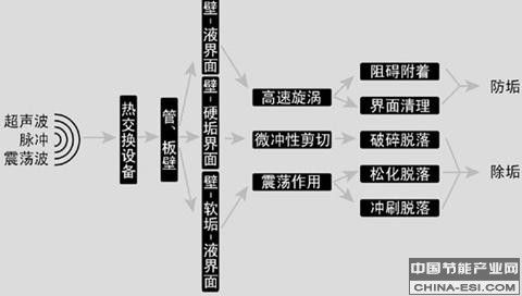 超声脉冲振荡波在换热器管、板壁传播,在金属管、板壁和附近的液态介质之间产生效应,破坏污垢的附着条件,防止换热设备在运行过程中结垢,提高换热设备传热能力,降低达到同样工艺要求所需的能耗量,实现节能目的。